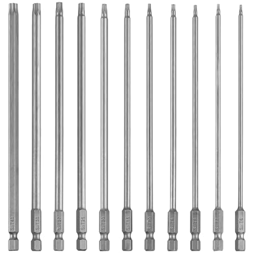 Fixinus 11 stycken Torx lång skruvmejsel bitssats, 1/4 tum magnetisk sexkantsskaft S2 stål 75 mm lång borr, säkerhets-torxbits T6-T40, med L-vinkelskruvmejselbitshållare