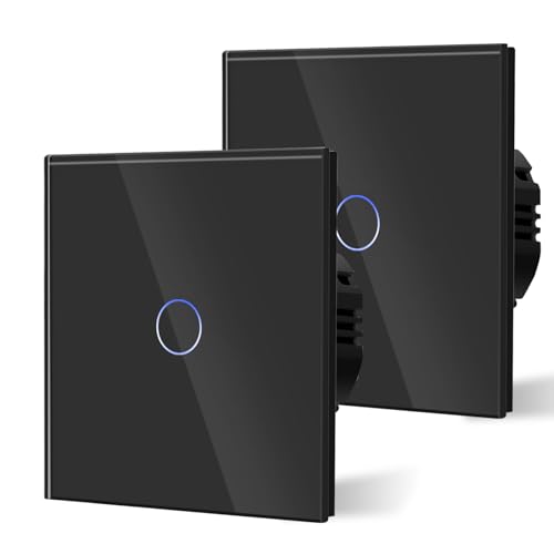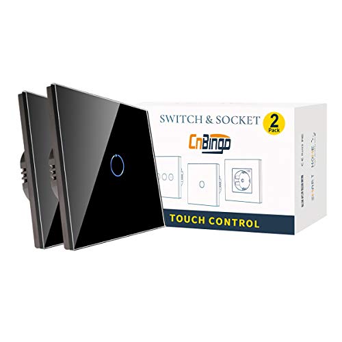CNBINGO 2-pack enkel strömbrytare svart, touchströmbrytare, med touch-system glaspanel och statusLED, neutral ledare behövs inte, 1-vägs 1-polig strömbrytare, AC 240 V, 500 W