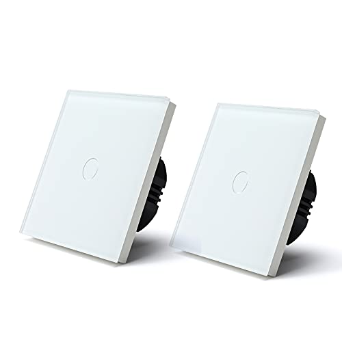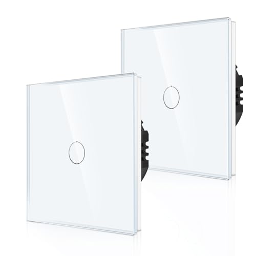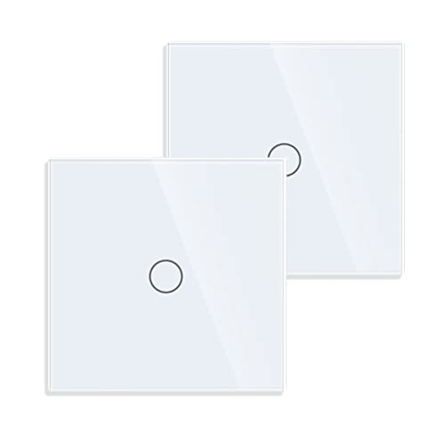 BSEED Touch-strömbrytare i panel av härdat glas, touchskärm, ingen wifi, 1 kontakt, 1-vägs, LED-lampa, härdat glass, pekskärm, 240 V, väggströmbrytare, 2-pack, vit