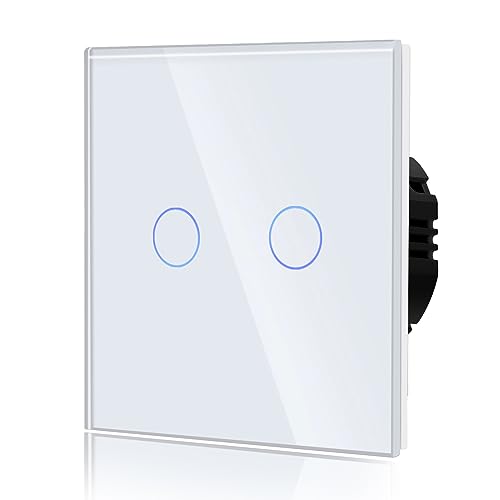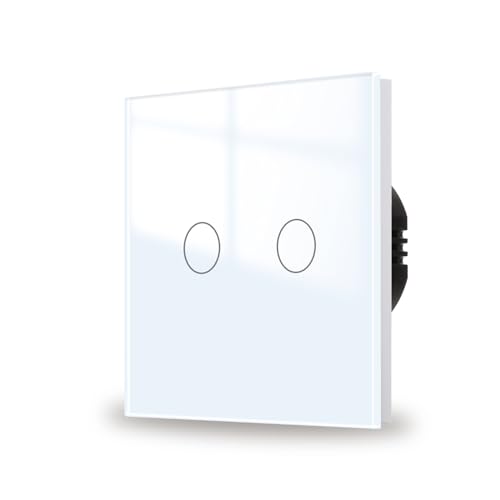 CNBINGO Dubbel strömbrytare vit, touchströmbrytare, med touch-system glaspanel och statusLED, neutral ledare behövs inte, 2-vägs 1-polig strömbrytare, AC 240 V, 500 W