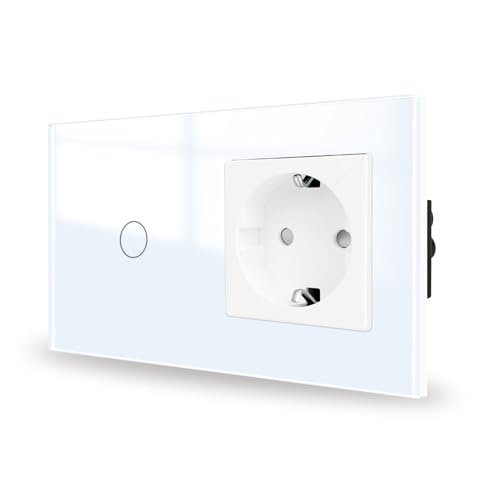 BSEED Strömbrytare med Schuko-uttag, i glas, infälld – 16 A, CEE-uttag, 1 ficka, 1-vägs touch-vägglampa, strömbrytare, vit, platt växelströmbrytare, modern, vattentät innerströmbrytare