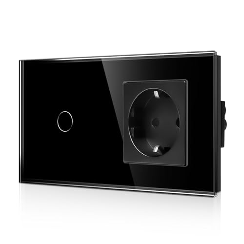 CNBINGO Glas strömbrytare och Schuko-uttag infälld – touch-strömbrytare med LED-status – väggströmbrytare med glasram – 1 fack svart