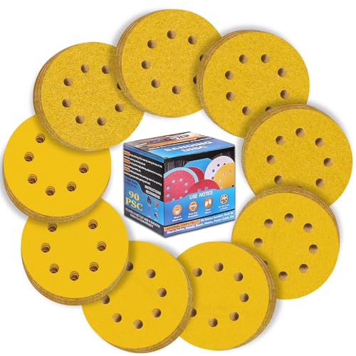 ALPXUXP Slipskivor 125 mm 8 Håls Rund Slippapper 90 stycken Set För Excenterslipmaskin Inkluderar Korn 40/60/80/120/150/220/ 320/400/600 x 10st För Slipning Trä 、Metall、Bilar、Sten Etc
