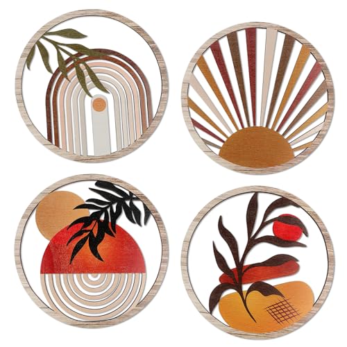 YiYa 4 stycken trä boho väggdekoration 3D rund bondgård väggdekoration rustik väggdekoration trä för vardagsrum bondgård vardagsrum barnrum