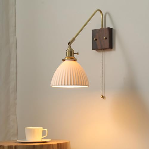 Vägglampa med svängbar arm och mjölkvitt glas, modern vägglampa från mitten av århundradet, gjord av glas med dragstång, rustik trä bondgård vägglampa för sovrum, nattduksbord, sänggavel, W