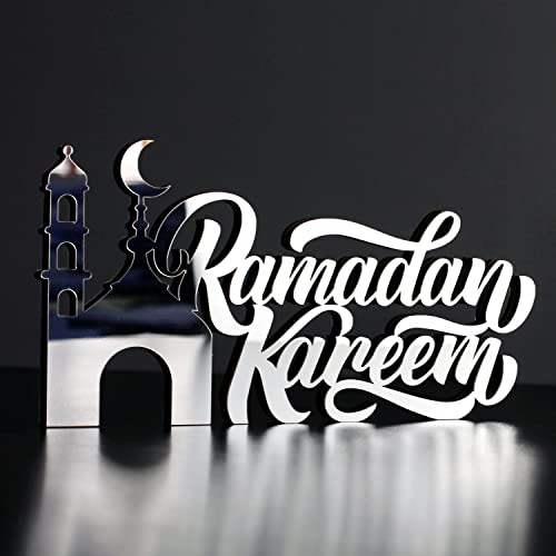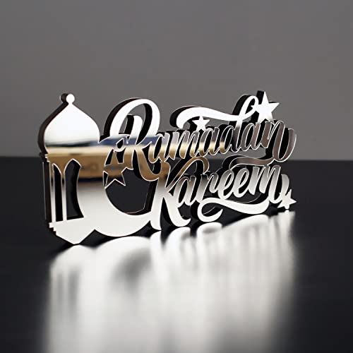 IWA CONCEPT Islamiska bordsdekorationer i trä, Ramadan Kareem- och Eid Mubarak-dekorationer, islamiska och muslimska gåvor, Ramadan Eid-dekoration (Ramadan Kareem-3, silver)