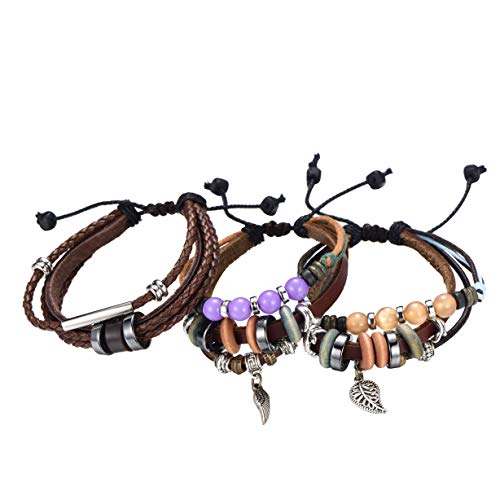 Morella damläderarmband set bestående av 3 armband med hängen och dekorationer, One size fits all, Läder tyg Trä, utan sten