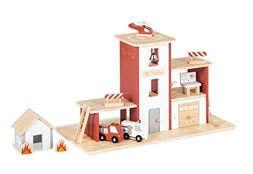 PINOLINO Brandstation 'Ben' med tillbehör, av trä, 12-stämmig, med garage, skjutbar stolpe och avrullningsslang, klar och färgglatt lackerad, röd