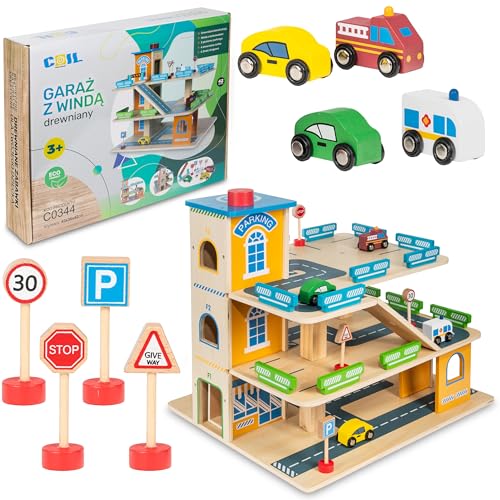 COIL Parkeringsgarage parkeringshus trä lekgarage lyft bil garage trägarage barn träleksaker tillbehör
