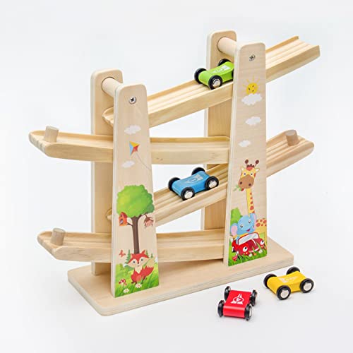Trä leksaker racerramp bil garage | bilrutschkana Zig Zag | leksaker för småbarn trä racerbana med 4 träbilar för 1 2 år pojke gåvor (skog)