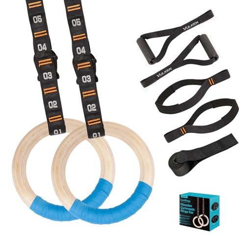 Vulken 32 mm gymnastikringar i trä med justerbara numrerade remmar. Olympiska ringar för kärnträning och kroppsviktsträning. Hemmagym ringar med träningshandtag. Blå