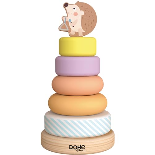 DOHE Educa – babyhoops i trä – 5 färgade ringar och bas, rolig hedgehog för toppen, barn och pedagogiskt material