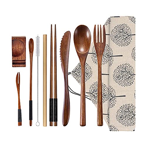 Återanvändbara träbestick-set, 9-delat bestickset inklusive återanvändbara knivar gaffel skedar ätpinnar sugrör och rengöringsborste