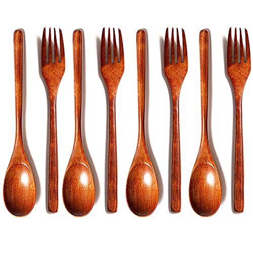 8 stycken träbestick, trägafflar, träspoon, träsked, köksredskap, återanvändbara naturligt träsked, gaffelset, för fest, bankett, buffé, catering, vardag, brun