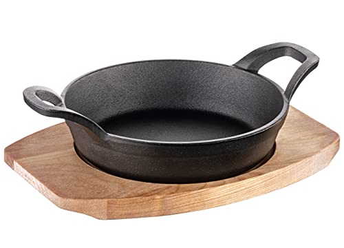Mäser 931937 Mini gjutjärnspanna med handtag på träbräda, liten gjutjärnspanna som stekpanna, grillpanna, serveringspanna, stekpannor för stekning och servering, diameter 16 cm, gjutjärn