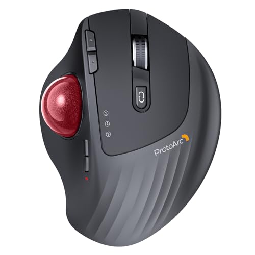 ProtoArc EM01 NL Trackball-mus, trådlös 2,4 G, USB och 2 x Bluetooth, tumkontroll, justerbar vinkel, justerbar vinkel med 5 dpi, uppladdningsbar mus för PC/Mac/iPad/Windows, Red Ball