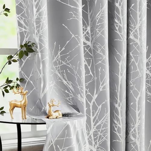 FMFUNCTEX Metalliskt träd mörkläggningsgardiner sovrum grå 213 cm vardagsrum gren tryck gardin paneler skog trippelväv värmeisolerade draperier för fönster sovsal hotell förstärkt topp, 2 paneler