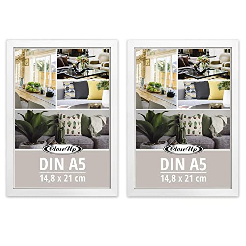 Close Up Bildramar, set om 2 DIN A5 (14,8 x 21 cm) | trädekor (MDF) vit med bakvägg och stativ | PVC-skiva (okrossbar) profilbredd 15 mm