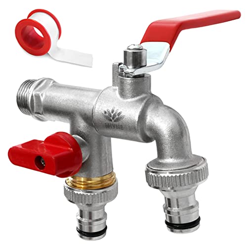 SHYNE Premium 1/2 '' Tum Dubbel Kran av Mässing | Rost- och Frostbeständig + 2x Slanganslutningar + E-Bok | för Trädgård, Tvättmaskin, Regnfat