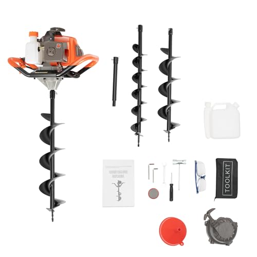52CC bensin jordborr staketstolpar, 2-takts jordhålsborr jordborr trädgårdsborr golvborr, handhållen, jordhålsborr stolborr med 3 borrdiameter (100, 150, 200 mm)