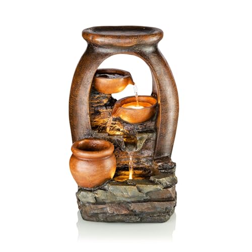 Inomhusfontän med LED-belysning, grön växt, fontän, trädgårdsfontän, dekoration, bordsfontän, vattenfall med dimma, 28 x 15 x 20 cm