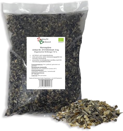 Saatzucht Bardowick Hornspån naturgödsel 5 kg, 100% naturgödsel med 14% kväve för grönsaks- och prydnadsträdgårdar, naturligt kvävegödsel och trädgårdsgödsel med långtidseffekt
