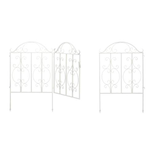 Relaxdays Trädgårdsgrind, 3 delar, stål, trädgårdsgrindar, ornament, trädgårdsdörr med 2 staketelement, H x B: 98,5 x 185 cm, vit