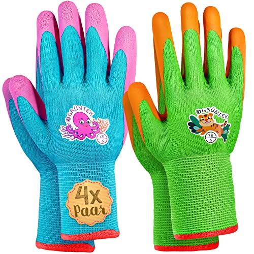GRÜNTEK Trädgårdshandskar för barn 4 par XXS / 2XS (storlek 5), skyddshandskar för barn, halkfri latexbeläggning, BPA-fria, fria från skadliga ämnen, testade och certifierade enligt EN 420 & EN 388