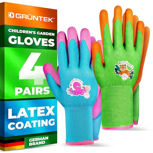 GRÜNTEK Trädgårdshandskar för barn 4 par XXXXS / 3XS (storlek 4), skyddshandskar för barn, halkfri latexbeläggning, BPA-fria, fria från skadliga ämnen, testade och certifierade enligt EN 420 & EN 388