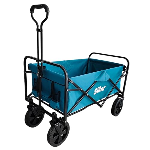 Sillar hopfällbar handlekärra, trädgårdskärra, kompakt med handtag, 4 förstärkta PVC-hjul, lastkapacitet upp till 80 kg, utomhus, trädgård, 100 l, 2 extra dryckesfickor på framsidan, blå