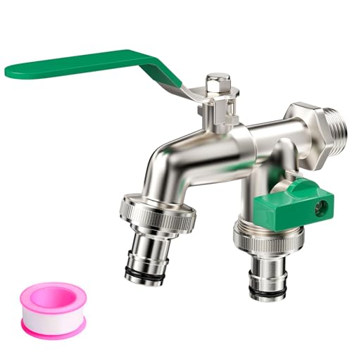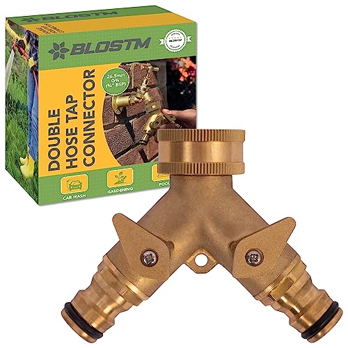BLOSTM Dubbel utloppskran - robust mässing utomhus trädgårdskran, anti-läckageanslutning för bevattningssystem, slangbevattning och trädgårdsutrustning