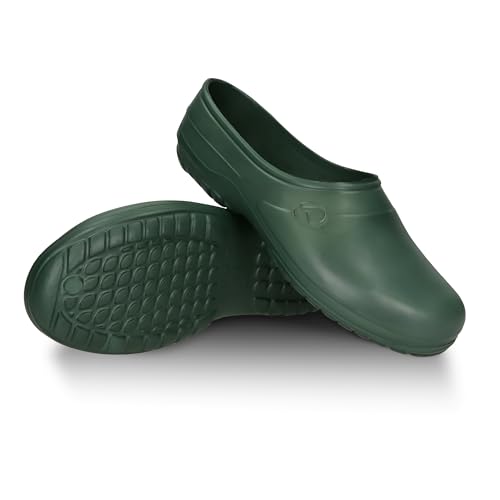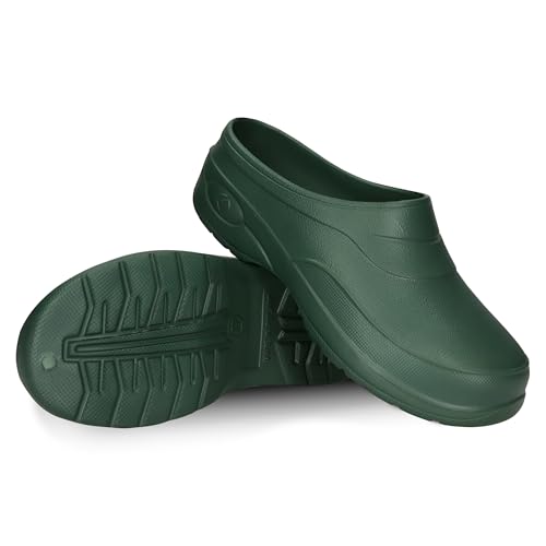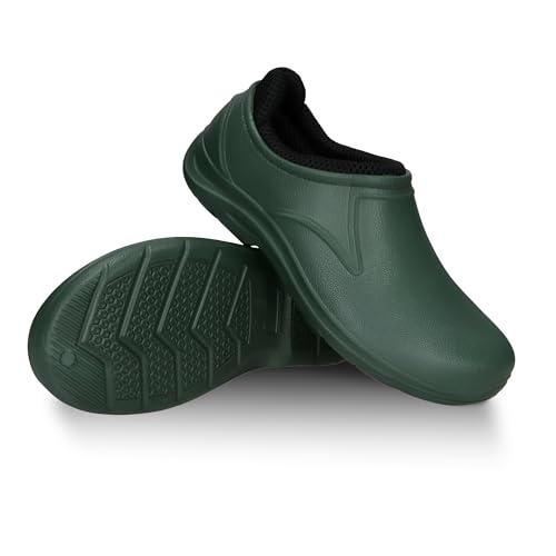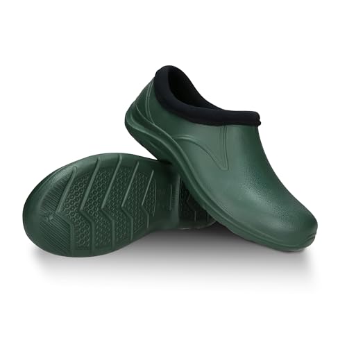 FUZZIO Lätta träskor för kvinnor, bekväma träskor för män, trädgårdsskor för män – fodrade trädgårdstofflor, trädgårdsskor för kvinnor, fodrade gummiskor, stängda, Grön, 45 EU