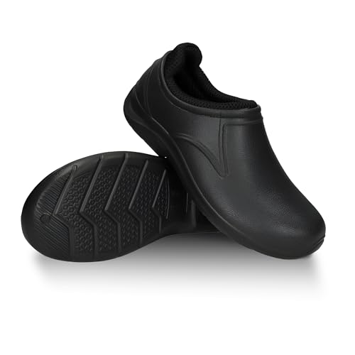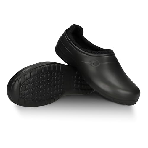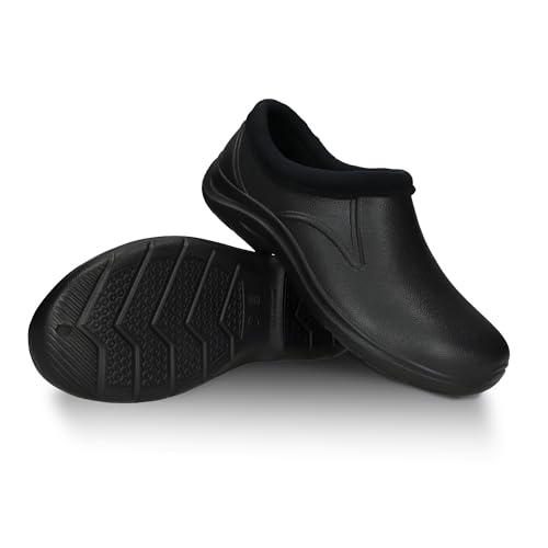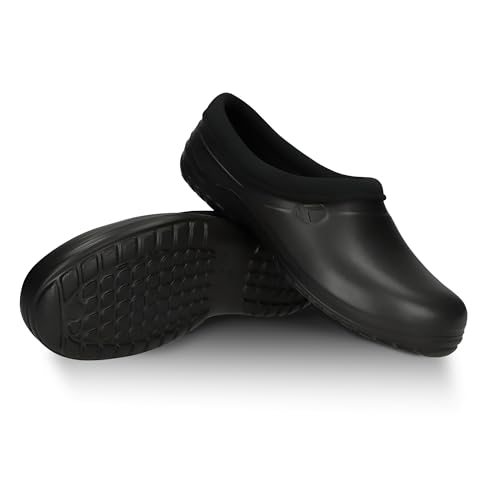 FUZZIO Lätta träskor för kvinnor, bekväma träskor för män, trädgårdsskor för män – fodrade trädgårdstofflor, trädgårdsskor för kvinnor, fodrade gummiskor, stängda, svart, 44 EU