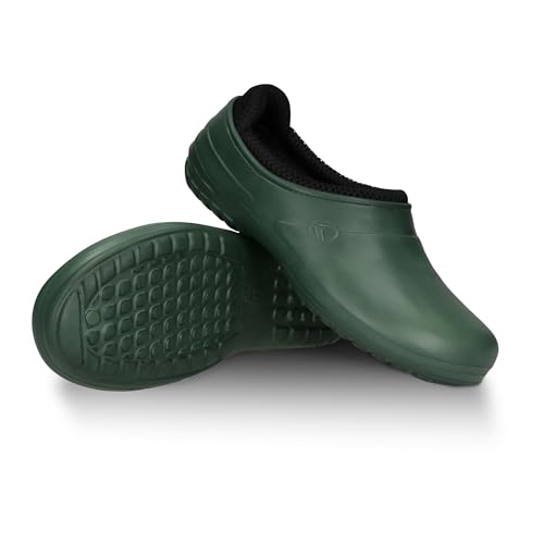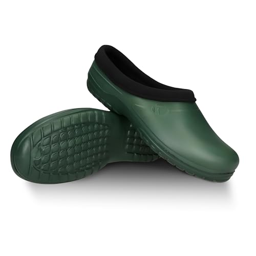 FUZZIO Lätta träskor för kvinnor, bekväma träskor för män, trädgårdsskor för män – fodrade trädgårdstofflor, trädgårdsskor för kvinnor, fodrade gummiskor, stängda, Grön, 44 EU