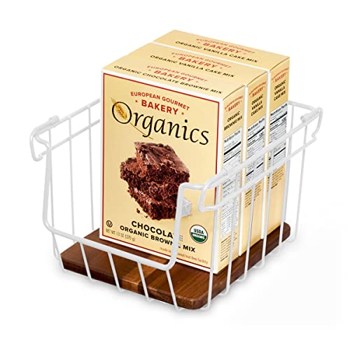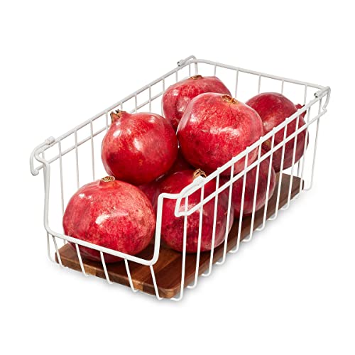 iDesign Trådkorg, förvaringskorg med öppen front av metall och akaciaträ, bult med handtag för att organisera skafferi och hushåll, vita och naturliga färger