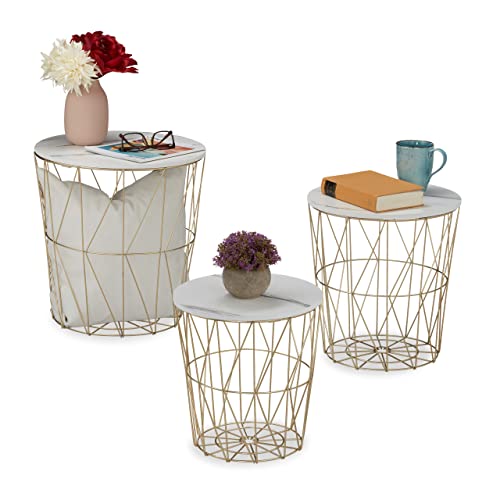 Relaxdays Korgbord set om 3, rund, sidobord vardagsrum, metall och marmorutseende, 3 storlekar, trådkorg-bord, vit/guld