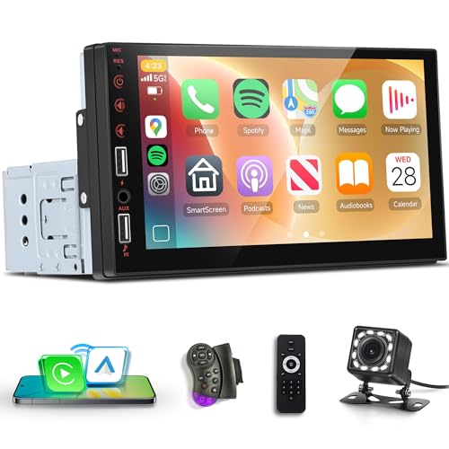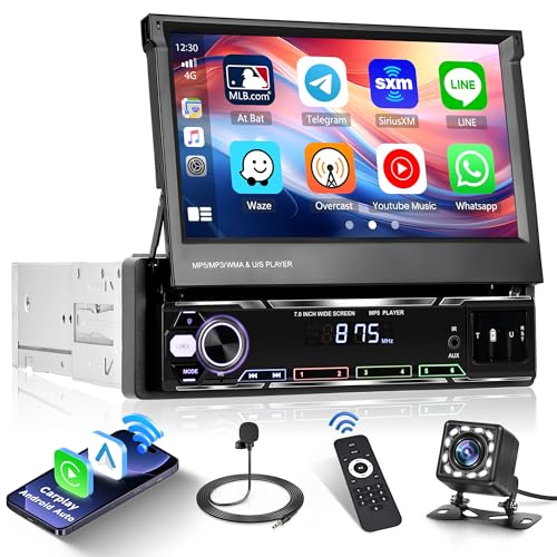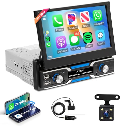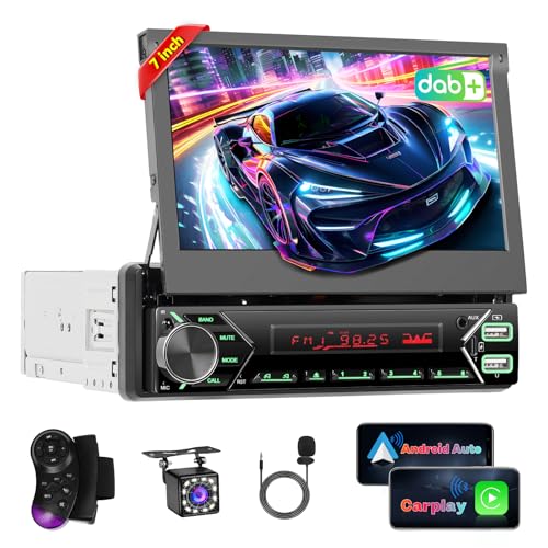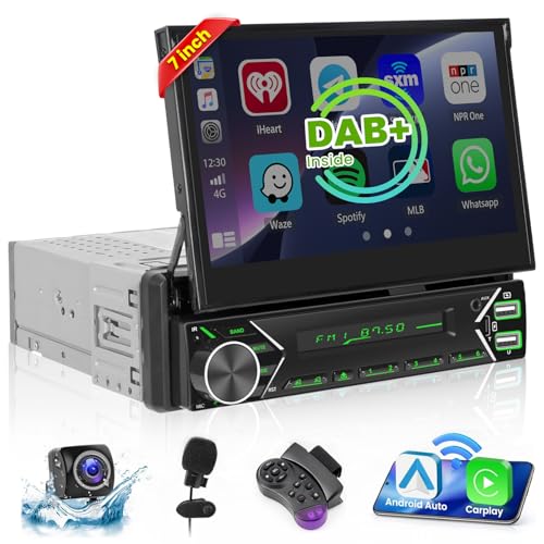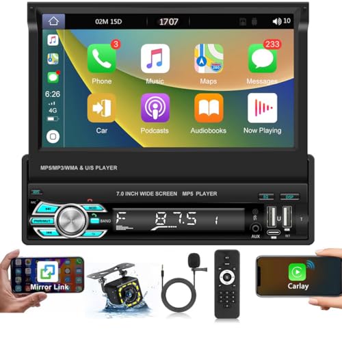 Inefala Carplay 1 Din bilradio med 7-tums automatisk infällbar skärm, trådlös Carplay Android Auto, radiostation med Bluetooth USB FM SWC backkamera och mikrofon