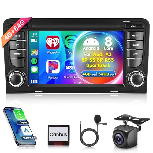 8 Core 4G+64G trådlös Carplay Android 13 bilradio 2 Din för Audi A3 8P A3 8P1 S3 RS3 8P RS3 Sportback 7 tums bilradio med Android bilnavigering GPS GPS WiFi Bluetooth FM/RDS/32 EQ/DAB/SWC backkamera