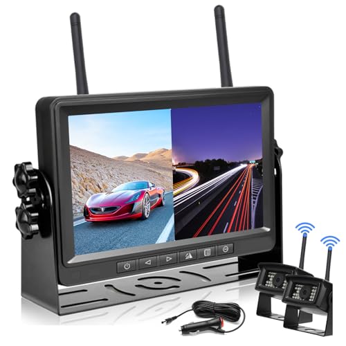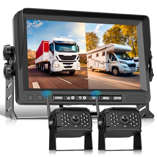 Rimoody Trådlös backkamera set med 2 kameror, 7 tums bildskärm, 2 delad skärm, bakkamera IP68 vattentät, mörkerseende, DVR, loopinspelning, bild flip för lastbil/buss/husbil/släpvagn