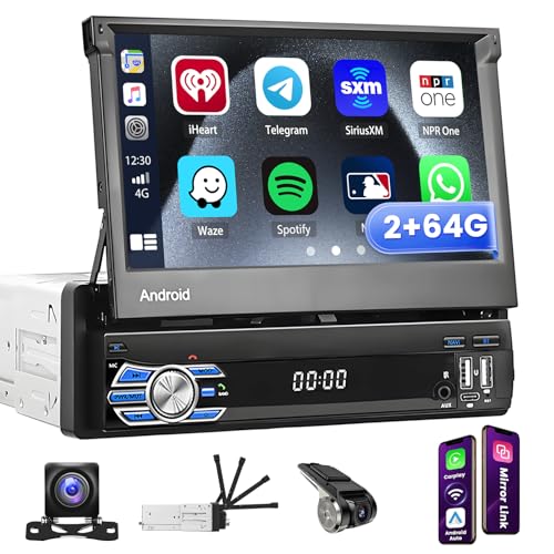 Trådlös Carplay bilradio 1 Din med Android Auto Mirror Link 7 tum manuellt infällbar skärm, bilradio med Mirror Link Bluetooth AM/FM/RDS Radio USB/AUX/MIC rattstyrning backkamera
