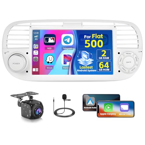 Inefala 2 + 64GB Autoradio för Fiat 500 2007-2015 Stereo 7 Tums Android med trådlöst CarPlay Android Auto Spegellänk med Bluetooth, GPS, SWC, Backkamera AHD, Vit