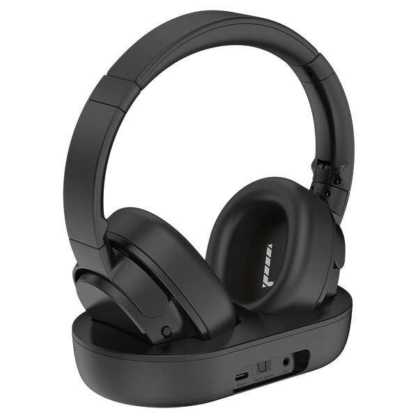 iDiskk trådlösa hörlurar för TV, Bluetooth 5.2 transmissor, laddningsstation, 35 timmars lydspelningstid, Digital Opt, RCA, AUX, Plug & Play, svart