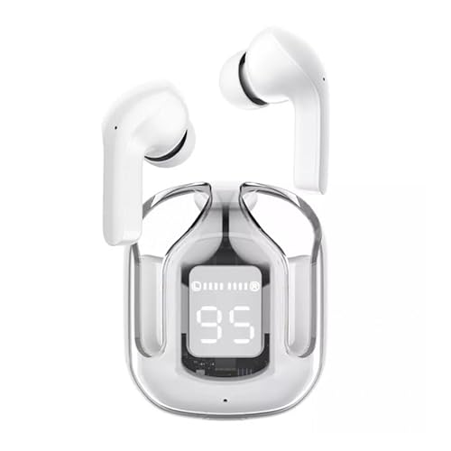 Vita trådlösa hörlurar med kudde, transparent laddningsfodral, digital display