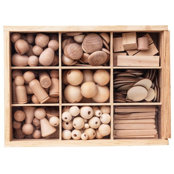 Låda med träfigurer i olika former & storlekar, cirka 260 stycken