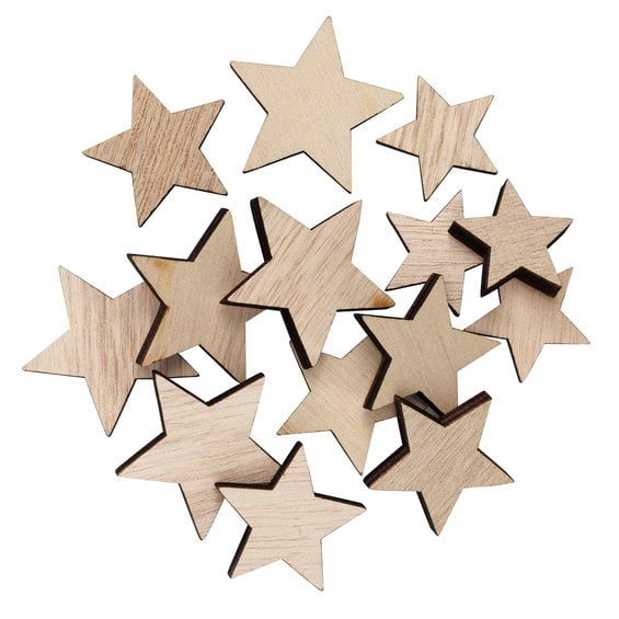 36 träfigurer i form av stjärnor i 3 olika storlekar