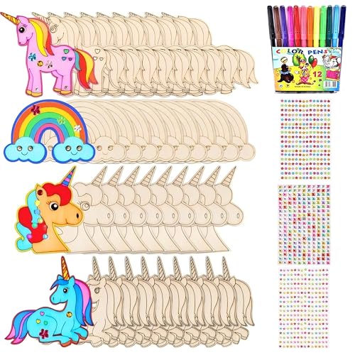 40 stycken pysselset för enhörning, trä enhörning pysselset att måla, barn gör-det-själv enhörningar trädekoration, träpysselset flickor barnfödelsedag, träfigurer att måla med strass + akvarellpenna