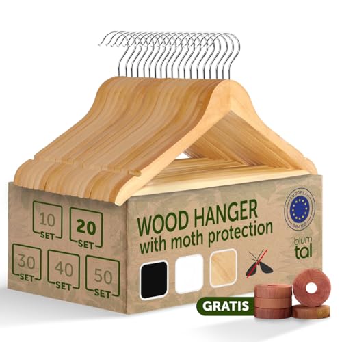 Blumtal Coat Hanger Wood Set of 20 - Trähängare med 360° vridbar metallkrok - Hängare tillverkad av robust massivt trä - Klädhängare i trä med halkfri byxstång & axelhak - Klädhängare