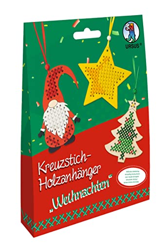 Ursus 21440004 Korsstygn jul, pysselset för barn med 3 trähängare, broderigarn, sticknålar, dekorationsmaterial och instruktioner, färgglada