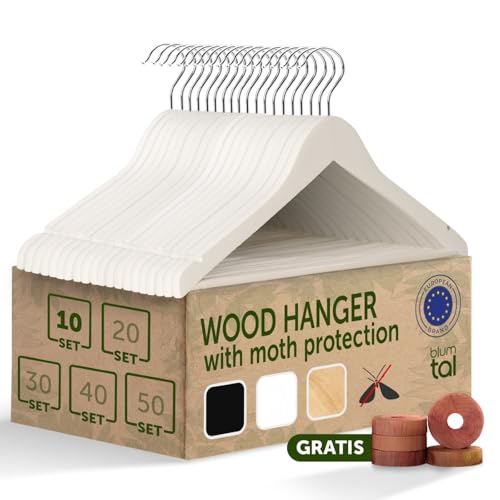 Blumtal Klädhängare Trä Vit Set om 20 - Trähängare med 360° vridbar metallkrok - Klädhängare av massivt trä - Klädhängare trä vit med halkfri byxstång & axelhak - Klädhängare trä