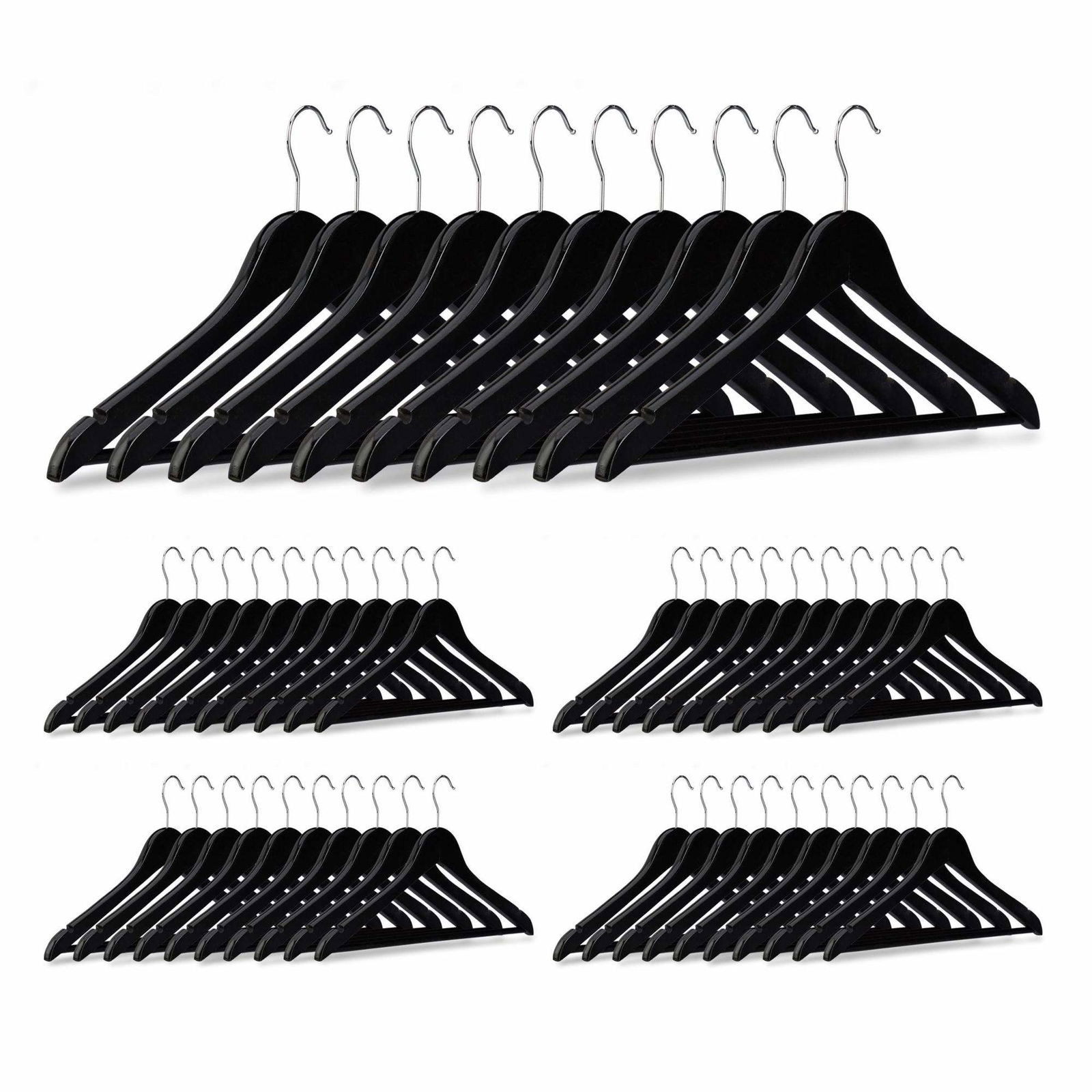 SONGMICS Klädhängare i trä, set med 20, massiva trähängare, skåror i axelområdet, halkfri byxstång, 360° roterande krok, för kostymer, skjortor, svart/silver CRW02B-20